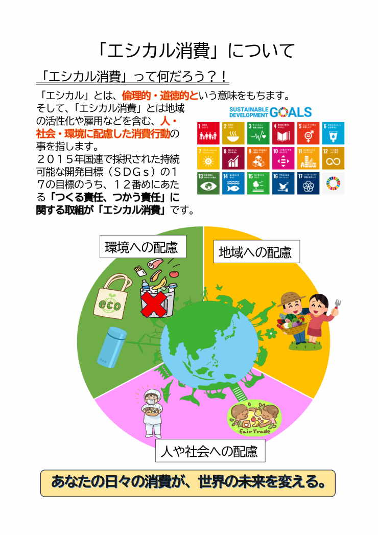 2015年国連で採択された持続可能な開発目標(SDGs)の17の目標のうち、12番めにあたる「つくる責任、つかう責任」に関する取組が「エシカル消費」です。