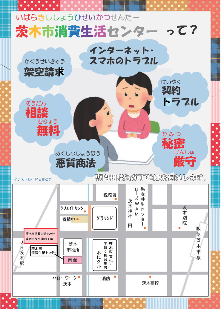 茨木市消費生活センターは、茨木市役所の南館1階にある、市民の相談窓口です。