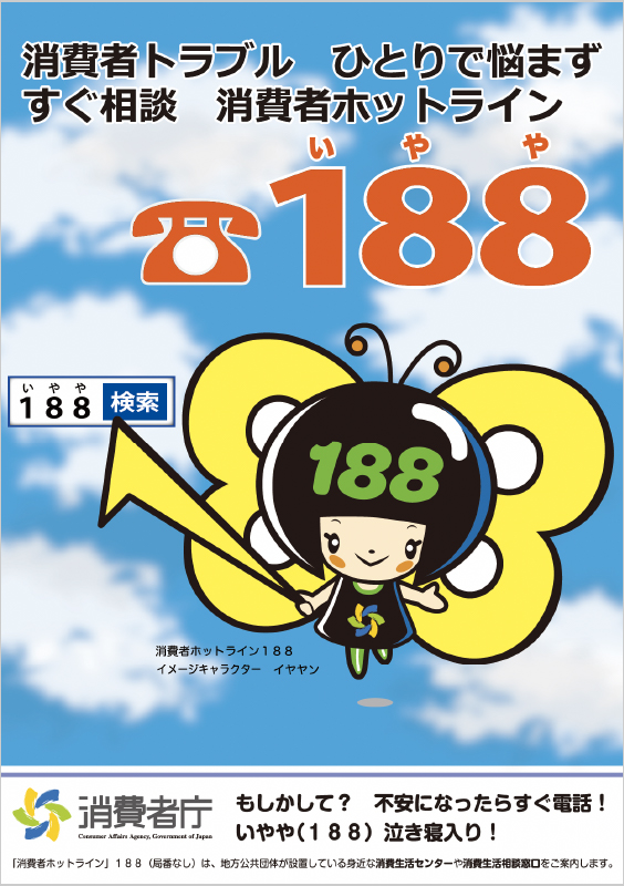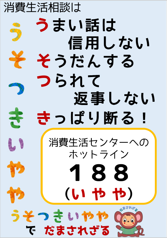 茨木市消費生活センターでは、トラブル防止の啓発や消費者ホットライン188(いやや)を知っていただくために、「だまされざる」をはじめ消費者庁の「イヤヤン」などいろいろな啓発キャラクターで188をPRしています。