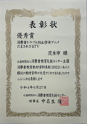 また、こちらで紹介している若者向け消費者トラブル啓発アニメ「だまされざるTV」は、(公財)消費者教育支援センター主催の、消費者教育教材資料表彰2022にて【優秀賞】を受賞しました。